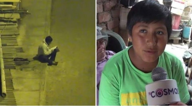 Uşaq küçə fənəri altında dərs oxuyur