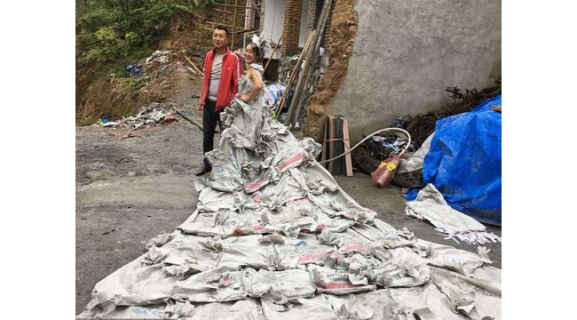 Sement kisələrindən gəlinlik tikdi