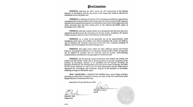 Amerikalı mer Xocalı qətliamının 29-cu ildönümü ilə bağlı bəyannamə imzalayıb