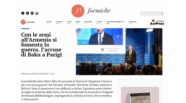 İtaliya saytı Prezident İlham Əliyevin Fransanın destruktiv fəaliyyətinə dair fikirlərini geniş işıqlandırıb