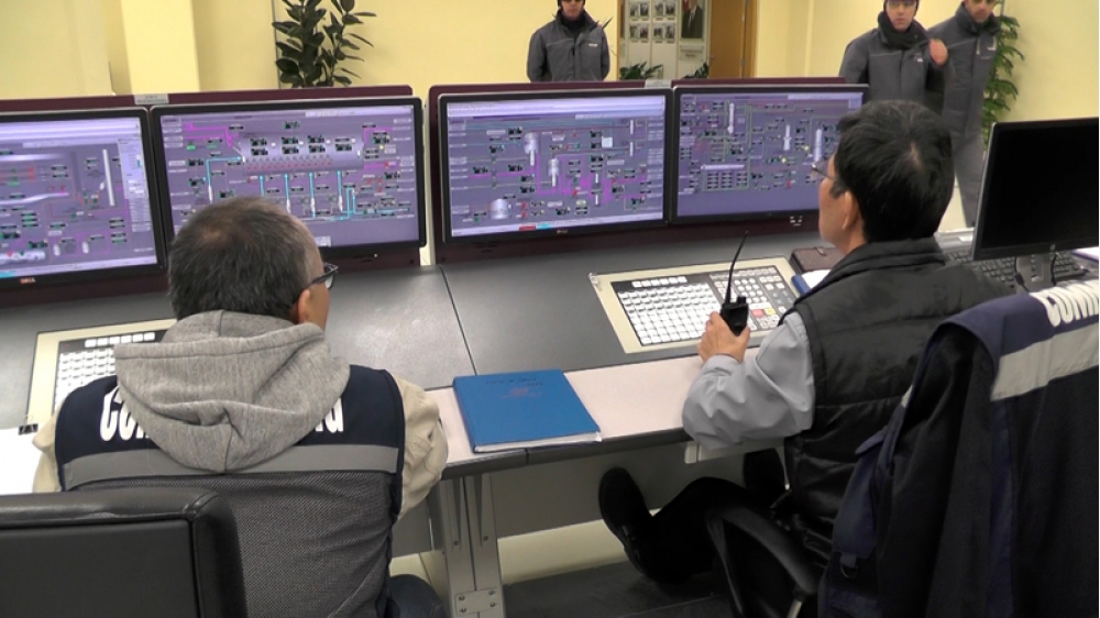 Karbamid zavodunun mərkəzi idarəetmə otağında da olduq. Burada bizə Karbamid zavodunun direktoru Xəyal Cəfərov məlumat verdi ki, işçilər üçün “Samsung Engineering”, “Neste Engineering Solutions” və lisenziar şirkətlər tərəfindən xüsusi təlimlər keçirilib. Zavodda təxminən 500 nəfər daimi işlə təmin edilib: “Hazırda biz mərkəzi idarəetmə otağındayıq. Bura da üç hissədən ibarətdir. Solda ammonyak, sağda karbamid, ortada köməkçi qurğulara aid olan idarəetmə pultlarıdır. Hazırda zavod sınaq-sazlama rejimində olduğu üçün burada həm koreyalı, həm də azərbaycanlı opartorlar çalışırlar. Onlar zavodun idarəetməsində bərabər işləyirlər. Zavod o qədər avtomatlaşdırılıb ki, bütün mexanizm bir monitorla idarə olunur. Koreyalı mütəxəssislər sınaq-sazlama işlərini görməklə yanaşı, yerli mütəxəssislərimizə də lazımı treninqlər keçirlər.”