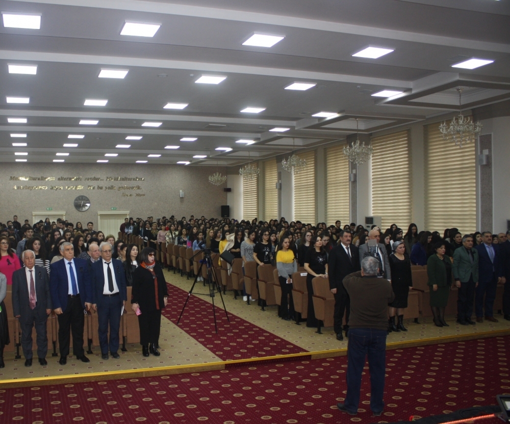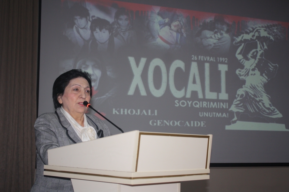Tədbiri giriş sözü ilə açan BSU-nun rektoru, professor Nurlana Əliyeva faciə qurbanlarının xatirəsini dərin hüznlə xatırlayaraq Ermənistanın Azərbaycana qarşı işğalçılıq siyasətinin tərkib hissəsi olan Xocalı soyqırımının ağır nəticələrindən danışıb. Rektor qeyd edib ki, 1992-ci il fevralın 25-dən 26-na keçən gecə baş verən Xocalı soyqırımı bəşər tarixində ən qanlı faciələrdən biridir. 27 il əvvəl Xocalıda neçə-neçə əliyalın azərbaycanlı qocanın, qadının, körpənin ermənilər tərəfindən xaincəsinə qətlə yetirildiyini deyən N.Əliyeva Ümummilli Lider Heydər Əliyevin müdrik siyasəti nəticəsində qanlı faciəyə hüquqi-siyasi qiymət verildiyini vurğulayıb. N.Əliyeva beynəlxalq hüququn norma və prinsiplərinin, insan hüquq və azadlıqlarının kütləvi şəkildə, kobudcasına pozulması ilə nəticələnən, bəşər tarixinə böyük qanlı faciə kimi daxil olan bu terror aktının Azərbaycan xalqının qan yaddaşında silinməz izlər qoyduğunu diqqətə çatdırıb. Professor Nurlana Əliyeva ölkə daxilində, o cümlədən ölkədən kənarda Xocalı soyqırımını dünya ictimaiyyətinə çatdırmaq istiqamətində görülən işlərdən, təşkil olunan aksiya və tədbirlərdən söz açaraq həmvətənlərimizin Ümummilli Lider Heydər Əliyevin azərbaycançılıq idealogiyasını rəhbər tutaraq dövlət siyasətinə dəstək olduqlarını bildirib. Yaxın zamanda torpaqlarımızın düşmən tapdağından azad olunacağını əminliklə vurğulayan Nurlana Əliyeva gəncləri düşməndən qisas almaq üçün hər an hazır olmağa səsləyib.