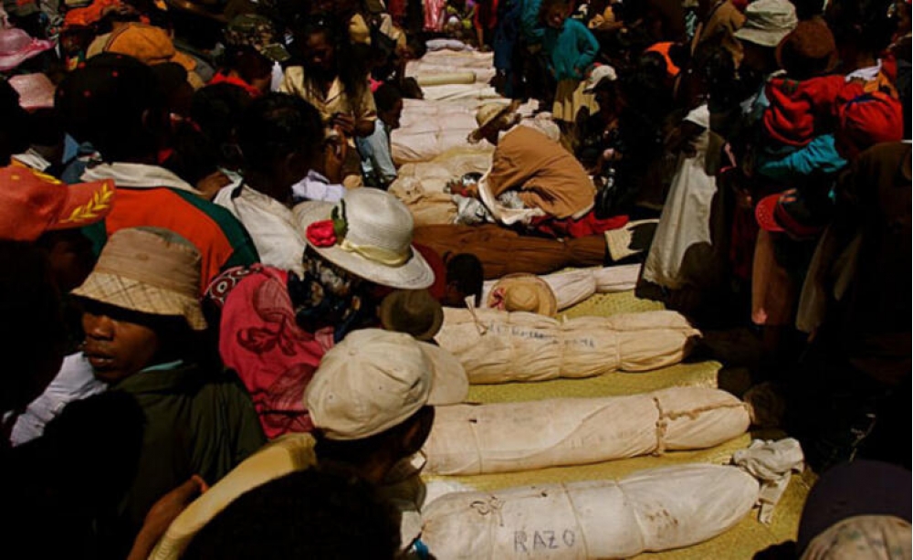 “Famadihana” festivalı zamanı madaqaskarlılar mərhum yaxınlarına yeni paltar geyindirirlər. Sonra da mərhum qohumlarının sümükləri ilə parad təşkil edir və canlı musiqi ilə rəqs edirlər.