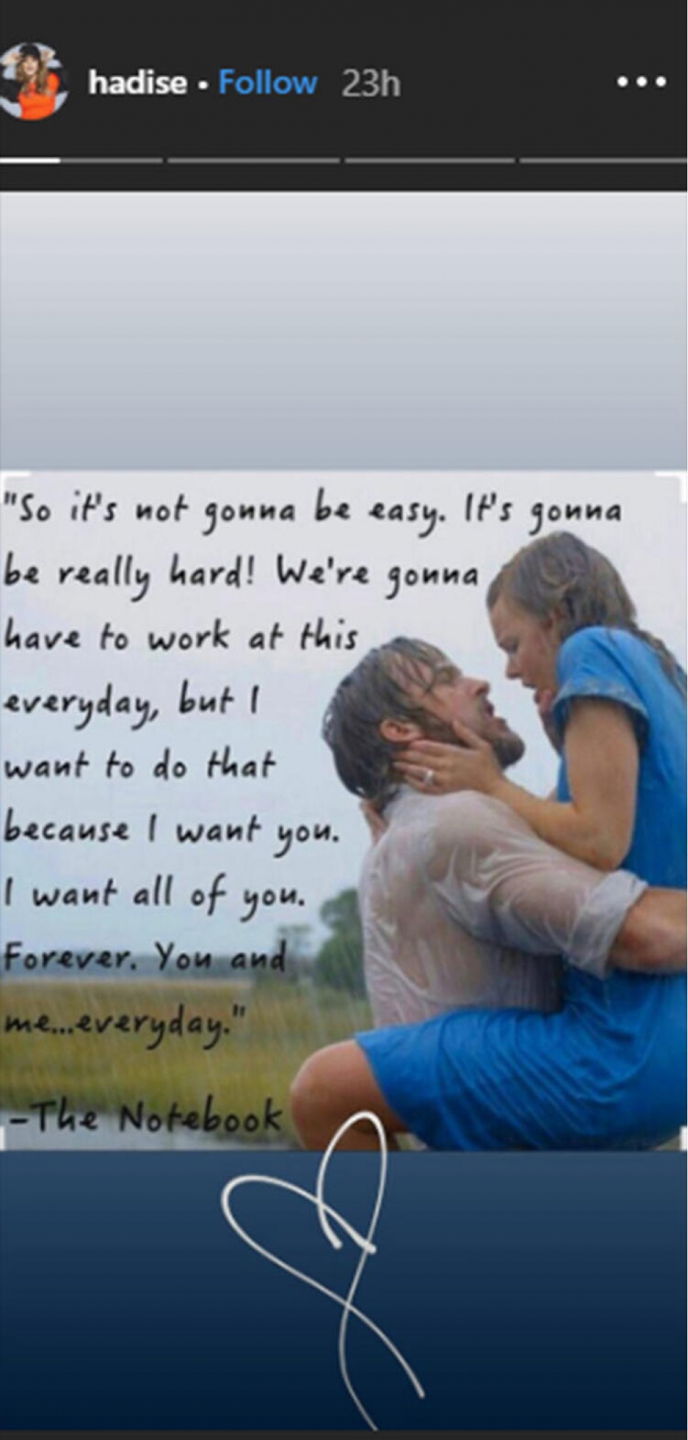 Hadisənin son hərəkəti isə iddialara aydınlıq gətirib. Müğənni “The Notebook” filmindəki “Bu asan olmayacaq. Həqiqətən çətin olacaq! Bu barədə hər gün çalışmalıyıq, amma bunu etmək istəyirəm, çünki səni istəyirəm. Sənə məxsus olan hər şeyi istəyirəm. Əbədi. Sən və mən ... hər gün” fikirləri yazaraq şəkil paylaşıb.