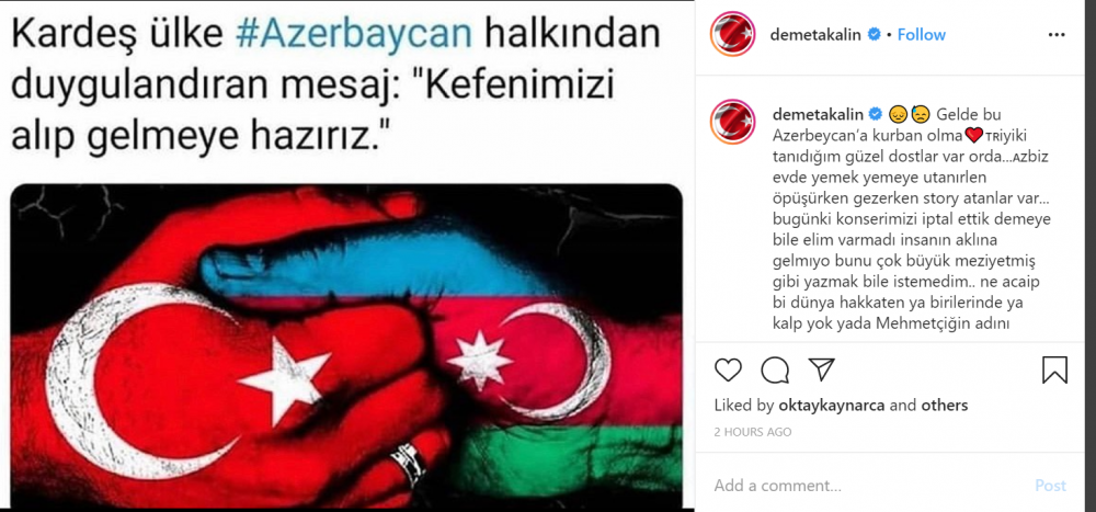 "İki sahil" Türkiyə mətbuatına istinadən xəbər verir ki, bu sözləri türkiyəli müğənni Demet Akalın sosial media hesabında yazıb.