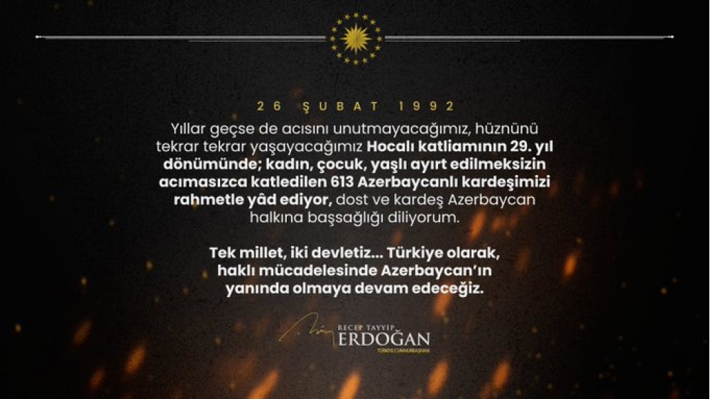 “İllər keçsə də acısını unutmayacağımız, hüznünü təkrar-təkrar yaşacağımız Xocalı qətliamının 29-cu ildönümündə qadın, uşaq, yaşlı demədən amansızcasına qətlə yetirilən 613 azərbaycanlı qardaşlarımızı rəhmətlə yad edir, dost və qardaş Azərbaycan xalqına başsağlığı verirəm. Bir millət, iki dövlətik... Türkiyə olaraq haqlı mübarizəsində Azərbaycanın yanında olmağa davam edəcəyik”, - dövlət başçısı qeyd edib.
