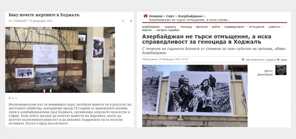 "Bolqarıstan-Azərbaycan Dostluğunun İnkişafına Yardım" İctimai Birliyinin təşəbbüsü ilə Bolqarıstanın http://"fakti.bg", "http://standartnews.com" və "http://eurocom.bg" xəbər saytlarında "Azərbaycan qisas deyil, Xocalı soyqırımına münasibətdə ədalət axtarır" sərlövhəli məqalə yayımlanıb.