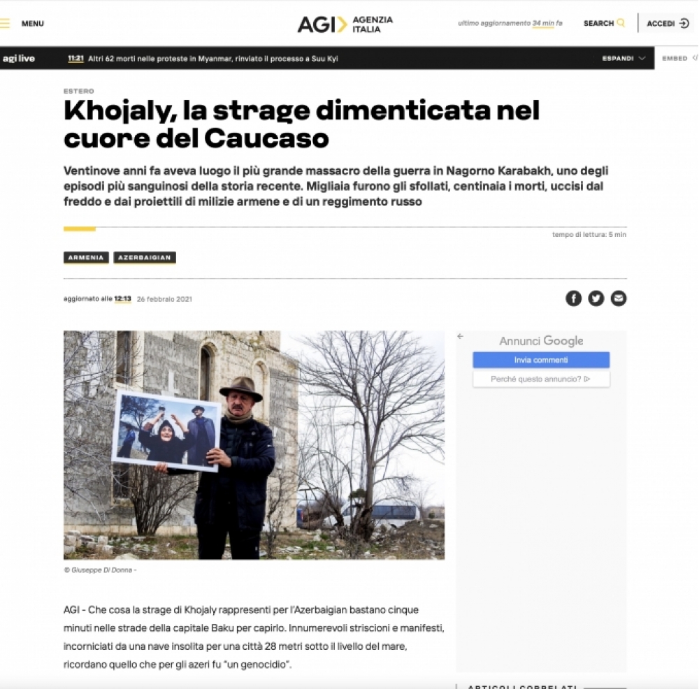 İtaliyanın AGİ xəbər agentliyi XX əsrdə bəşər tarixinin ən qanlı faciələrindən biri olan Xocalı soyqırımına həsr edilmiş “Xocalı – Qafqazın qəlbində unudulmuş qırğın” adlı məqalə yayıb.