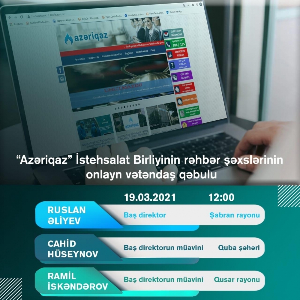 “Azəriqaz” İstehsalat Birliyinin rəhbər şəxslərinin növbəti onlayn vətəndaş qəbulu martın 19-u saat 12:00-da keçiriləcək.