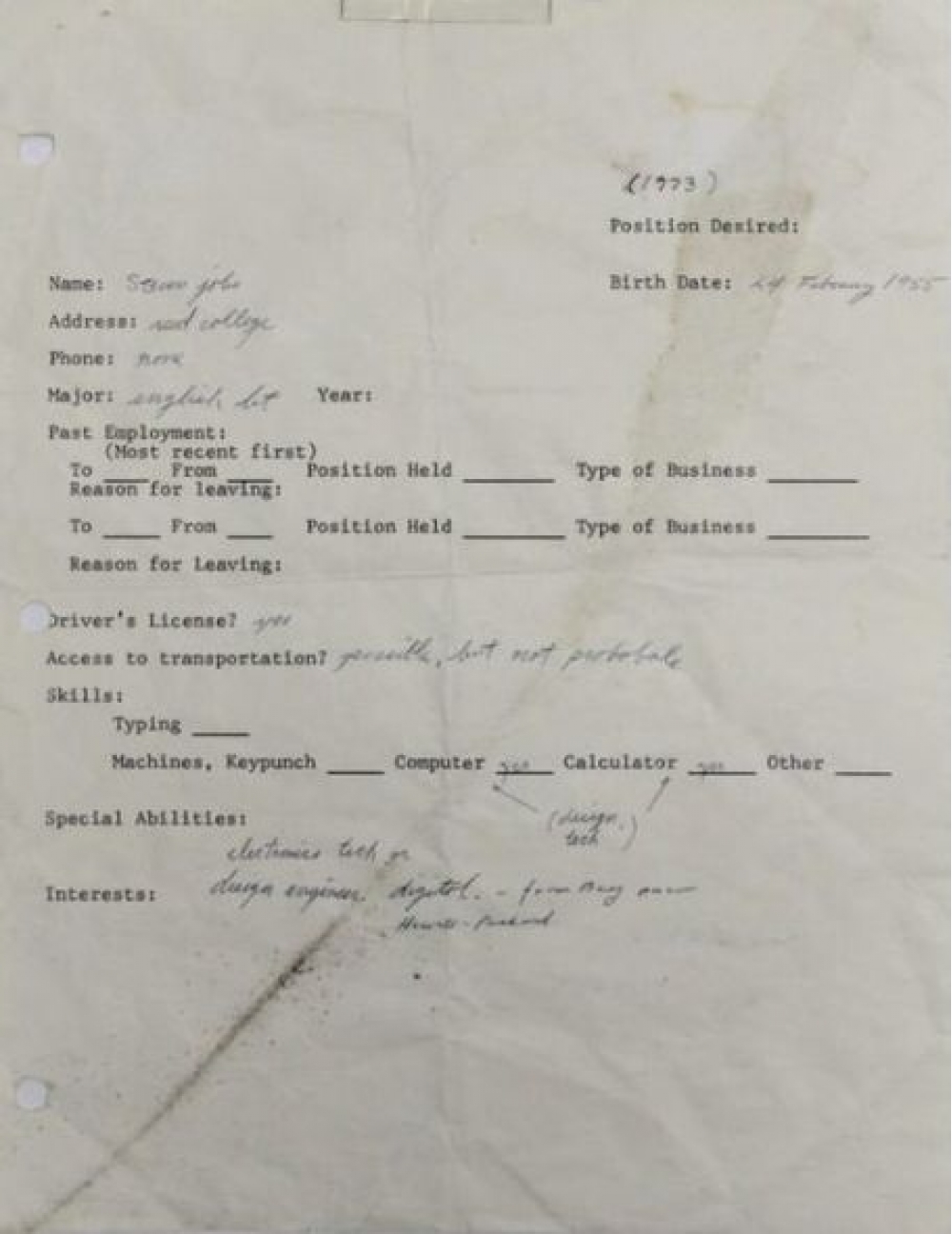 "İki sahil" xəbər verir ki, bu barədə “Charterfields” hərrac şirkətinin saytında qeyd olunub. Bir səhifədən ibarət anket 1973-cü ildə S.Cobsun çox güman ki, Portlenddə Rid kollecini tərk etdikdən sonra əlyazısı ilə doldurulub. Bir il sonra S.Cobs “Atari” şirkətinə texniki mütəxəssis kimi işə düzəlib. Burada 1976-cı ildə “Apple” şirkətinin əsasını birlikdə qoyduqları Stiv Voznyakla birgə çalışıb.