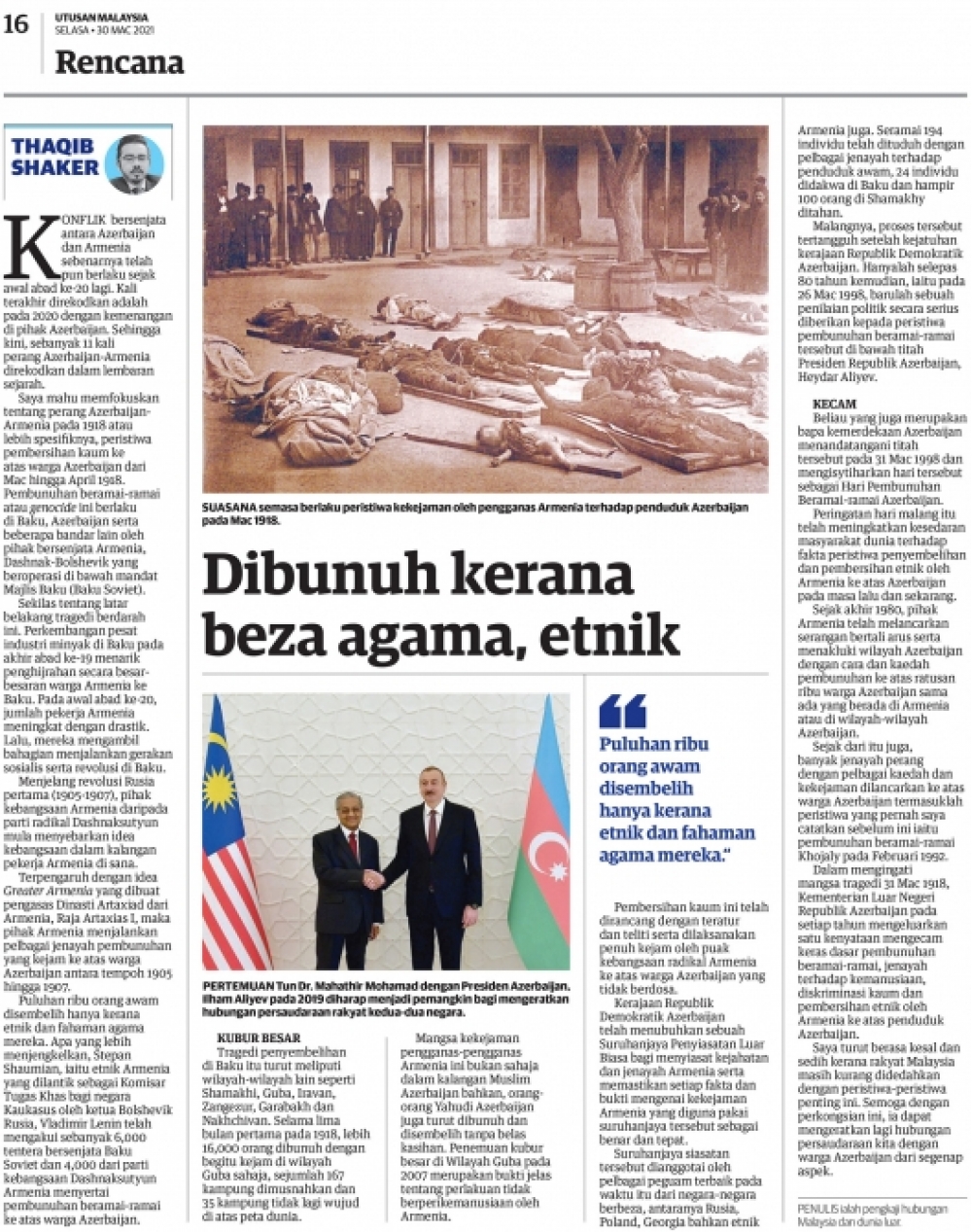 Malayziyanın nüfuzlu “Utusan Malaysia” qəzeti jurnalist Taqib Şakerin 31 mart - Azərbaycanlıların Soyqırımı Günü ilə əlaqədar geniş məqaləsini dərc edib.