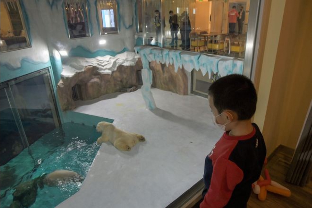 “Reuters”in əməkdaşının çəkdiyi fotoşəkillər 2 qütb ayısının süni buzlu kiçik bir hovuzda yaşamağa çalışdığını və insanların onları qapalı yerlərdən izləməyə çalışdığını göstərir. Otelin sözçüsü Yang Liu bildirib ki, hava şəraiti imkan verdiyi halda qütb ayılarını çölə buraxırlar. Otelin gecə qiymətləri 290-351 dollar arasında dəyişir. Otelə maraq olduqca böyükdür.