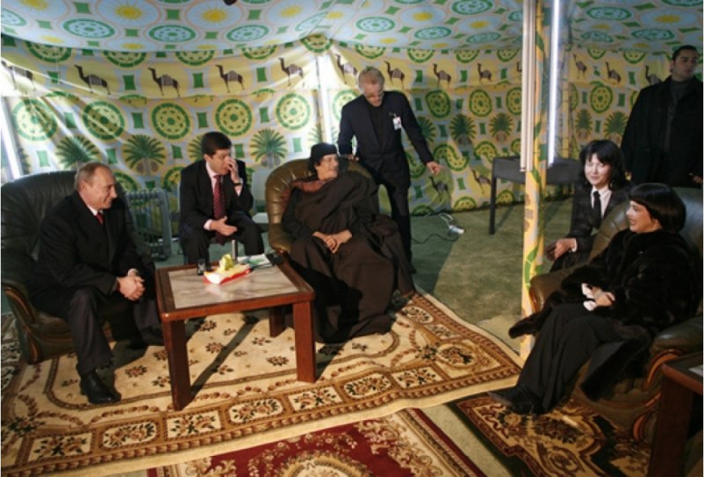 Qəddafi, həmçinin xaricdəki səfərlərində olarkən, təhlükəsizlik səbəbiylə özü ilə şəxsi çadırlarını aparırdı.Hətta 2008-ci ildə Moskvada səfərdə olarkən onun çadırı Kremlin ərazisində qoyulmuşdu.