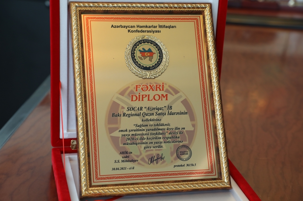 SOCAR-ın “Azəriqaz” İstehsalat Birliyinin (İB) Bakı Regional Qazın Satışı Departamenti (BRQSD) Respublika Həmkarlar İttifaqları Konfederasiyasının fəxri diplomu ilə təltif olunub. Respublika müsabiqəsi “Sağlam və təhlükəsiz əmək şəraitinin yaradılması üzrə ilin ən yaxşı müəssisəsi” devizi ilə keçirilib.