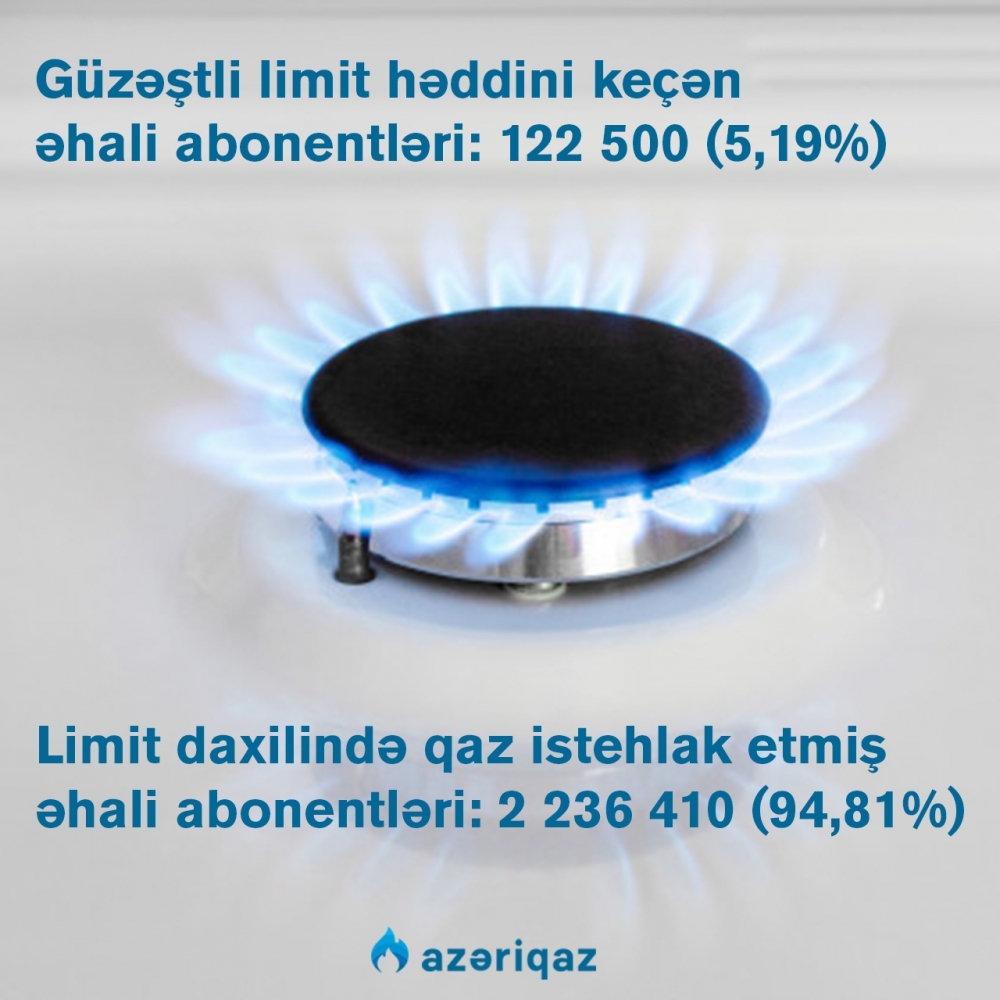 Qeyd edək ki, 2020-ci ildə əhali abonentlərinin 20.9 %-i illik hər kubu 10 qəpikdən satılan 2200 kubmetrlik güzəştli limit həddini keçib. Yerdə qalan 79.1 % əhali abonenti isə qazdan güzəştli limit daxilində istifadə edib. 2021-ci il may ayının 1-nə olan məlumata görə “Azəriqaz” İstehsalat Birliyində qeydiyyata alınan təbii qazla təmin olunan əhali abonentlərinin sayı 2 milyon 358 min 910-a bərabər olub.