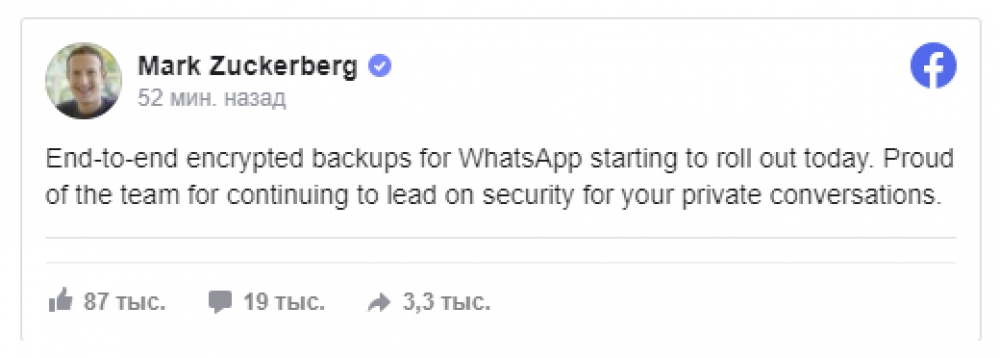 Zukerberq şəxsi söhbətlərin təhlükəsizliyini təmin etdikləri üçün “WhatsApp” komandasıyla fəxr etdiyini bildirib.