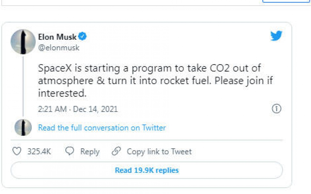 "Tesla" şirkətinin rəhbəri, "SpaceX"in yaradıcısı və baş direktoru İlon Mask raket yanacağının yaradılması üçün atmosferdən karbon qazının (CO2) çıxarılması proqramının işə salınması barədə xəbər verib.