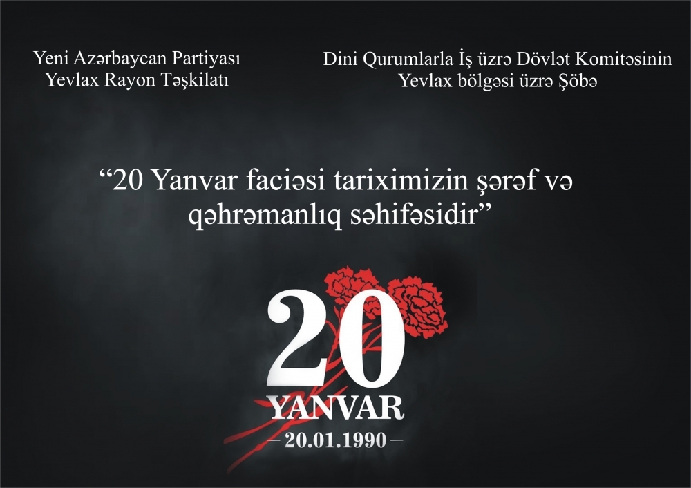 YAP Yevlax rayon təşkilatının, Dini Qurumlarla İş üzrə Dövlət Komitəsinin Yevlax bölgəsi üzrə şöbəsinin birgə təşkilatçılığı ilə "20 Yanvar faciəsi tariximizin şərəf və qəhrəmanlıq səhifəsidir" mövzusunda tədbir keçirilib.
