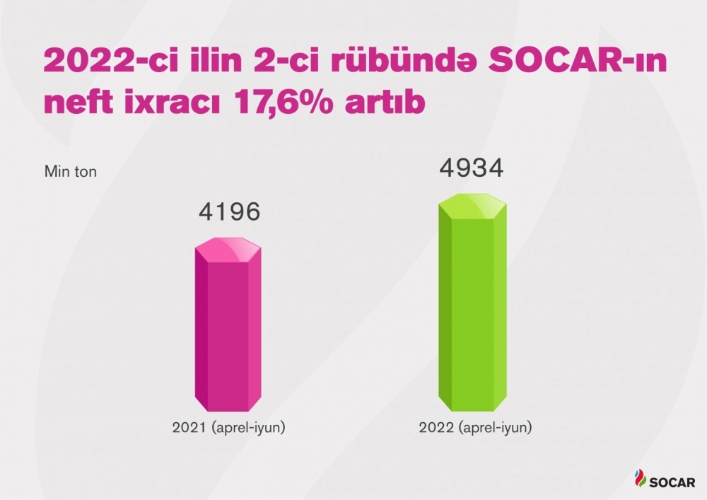 Hesabat dövründə SOCAR tərəfindən dünya bazarına 4,9 milyon tondan6 çox xam neft, Gürcüstan bazarına isə 144 milyon kubmetrə7 yaxın təbii qaz ixrac olunub. Ümumilikdə isə ölkə üzrə qaz ixracı 36% artımla təqribən 5,5 milyard kubmetrə8 yüksəlib. SOCAR-ın dünya bazarına ixrac etdiyi neftin həcmi ötən ilin analoji dövrü ilə müqayisədə 17,6%, Gürcüstana ixrac etdiyi qaz həcmləri isə 48,1% artıb. Qeyd edək ki, SOCAR öz imkanları ilə hasil etdiyi neftdən əlavə beynəlxalq konsorsiumlar çərçivəsində SOCAR və Azərbaycanın payına düşən neft həcmlərini də ixrac edir.