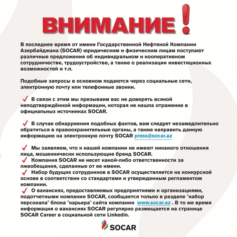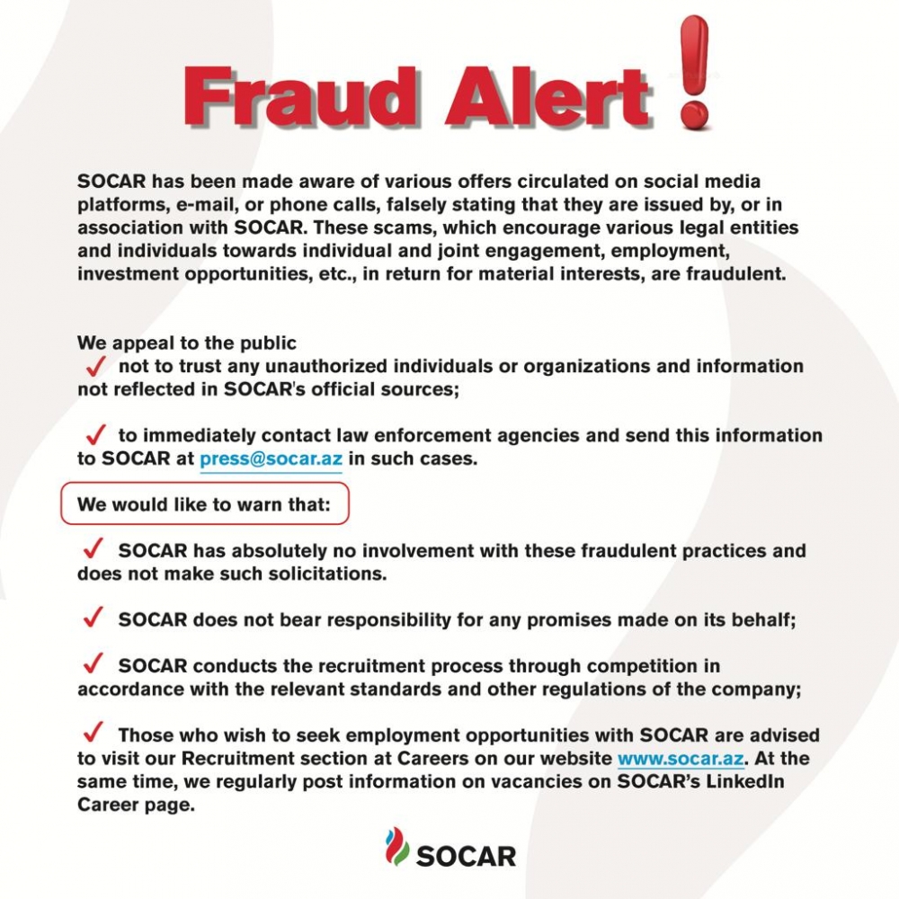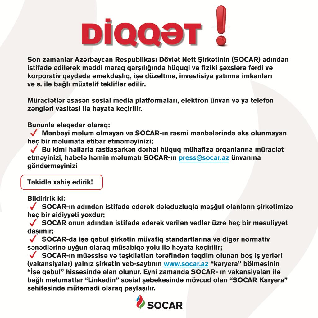 Məlumatda qeyd edilir ki, bir daha qeyd etmək istərdik ki, SOCAR-ın adından istifadə edərək dələduzluqla məşğul olan şəxslərin şirkətimizə heç bir aidiyyəti yoxdur. SOCAR onun adından istifadə edərək verilən vədlərə görə heç bir məsuliyyət daşımır. Vətəndaşlarımızdan sözügedən hallarla qarşılaşdıqda dərhal müvafiq hüquq-mühafizə orqanlarına müraciət etmələrini və həmin məlumatları [email protected] ünvanına göndərmələrini xahiş edirik. Bildiririk ki, SOCAR tərəfindən məsələ ilə bağlı hüquq-mühafizə orqanlarına müraciət edilib. Həmçinin vətəndaşlarımızın dələduzluq hallarının qurbanına çevrilməsinin qarşısını almaq məqsədilə media resursları və SOCAR-ın sosial şəbəkə hesabları vasitəsilə mütəmadi olaraq informasiyalar verilir. Məsələ ilə bağlı vətəndaşlar tərəfindən SOCAR-a edilən müraciətlər də dərhal cavablandırılır və onlara bu kimi dələduzluq hallarına dair ətraflı məlumat verilir. Xatırladırıq ki, SOCAR-da işə qəbul şirkətin müvafiq standartlarına və digər normativ sənədlərinə uyğun olaraq müsabiqə yolu ilə həyata keçirilir. SOCAR-ın müəssisə və təşkilatları tərəfindən təqdim olunan vakant iş yerləri şirkətin elektron veb səhifəsinin (www.socar.az) “Karyera” bölməsinin “İşə qəbul” hissəsində elan olunur. Müsabiqə qaydaları haqqında ətraflı məlumat həmin bölmədə yerləşdirilib. Fürsətdən istifadə edərək, bir daha vətəndaşlarımızı bu məsələ ilə əlaqədar ehtiyatlı olmağa çağırırıq.