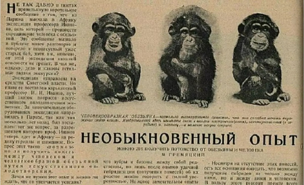 Məşhur sovet bioloqu İlya İvanov ev heyvanları üzərində apardığı müxtəlif təcrübələri ilə məşhurdur. Lakin onun təcrübəsinin əsasında çarpaz yolu ilə insan və meymun hibridini yaratmaq olub. Belə ki, o, erkək meymun və qadın üzərində təcrübələr aparıb onları mayalandırmağa çalışsa da istədiyi nəticəni əldə etməyib. Onun təcrübələri siyasi tənqidə məruz qalıb və nəticədə İvanovu həbs ediblər.