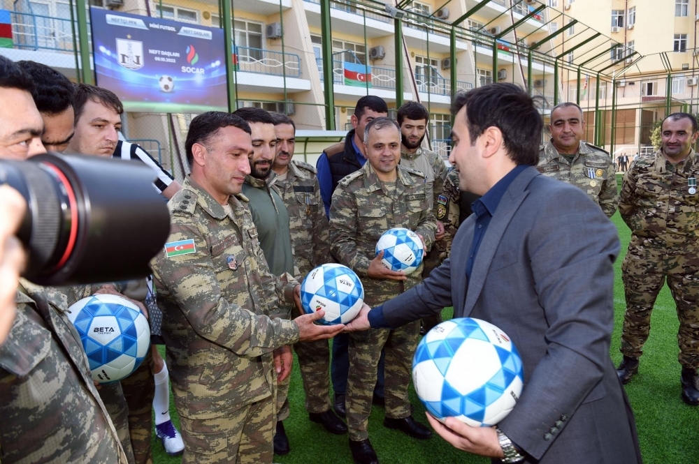 “Neftçi” PFK ilə neftçilər arasında keçirilən mini-futbol üzrə yoldaşlıq görüşünün əvvəlində Azərbaycan Respublikasının Dövlət himni səsləndirilib və Vətən uğrunda şücaət göstərərək canlarını qəhrəmancasına fəda etmiş şəhidlərimizin əziz xatirəsi bir dəqiqəlik sükutla yad edilib. Futbolçular topları, neftçilər dəbilqələri qarşılıqlı olaraq bir-birlərinə hədiyyə ediblər.