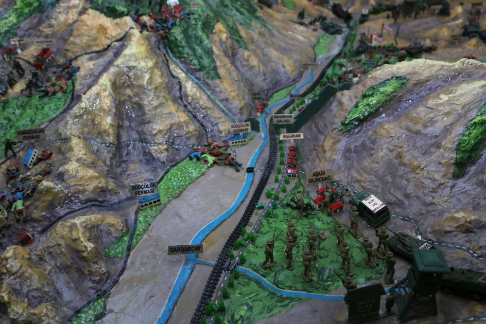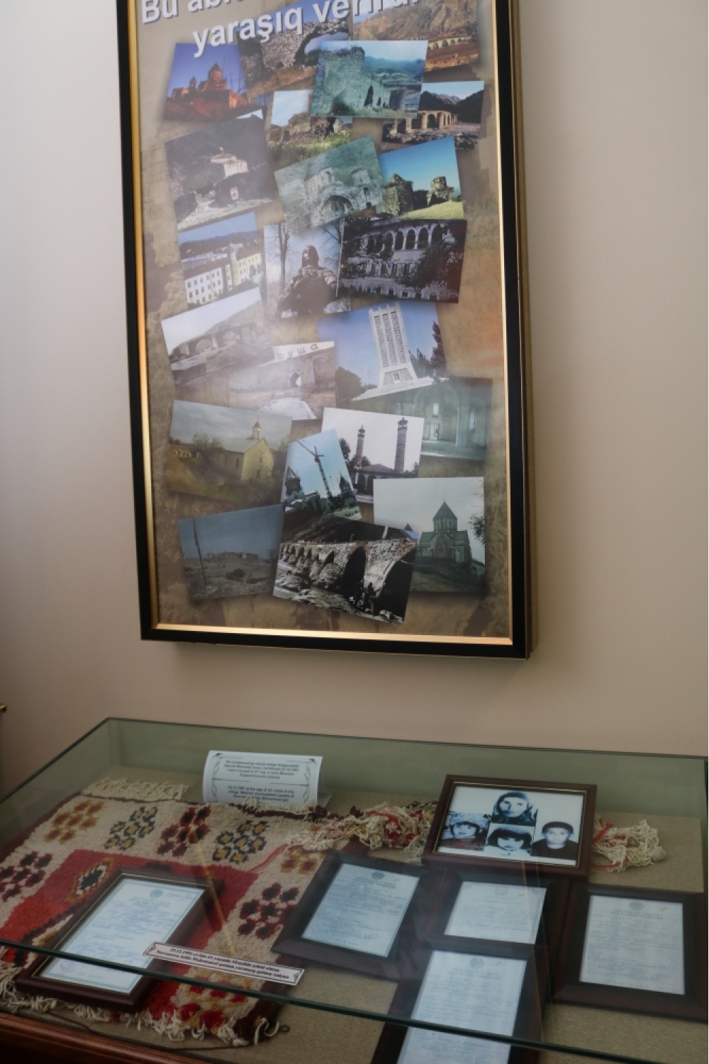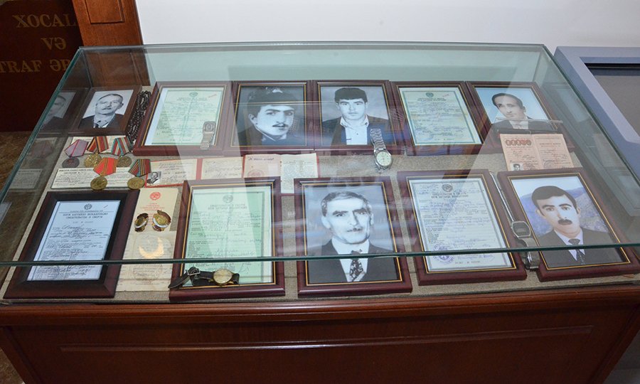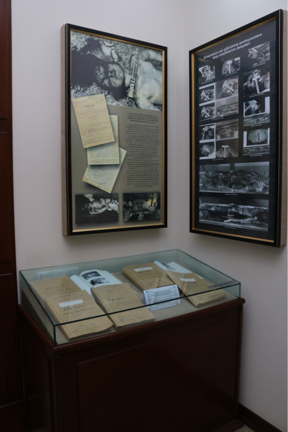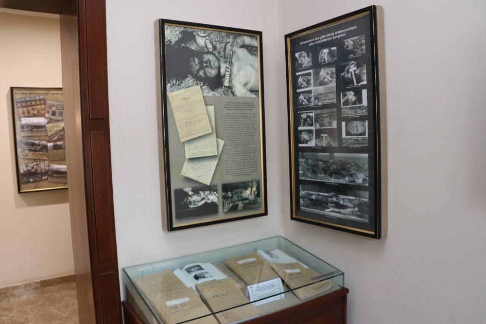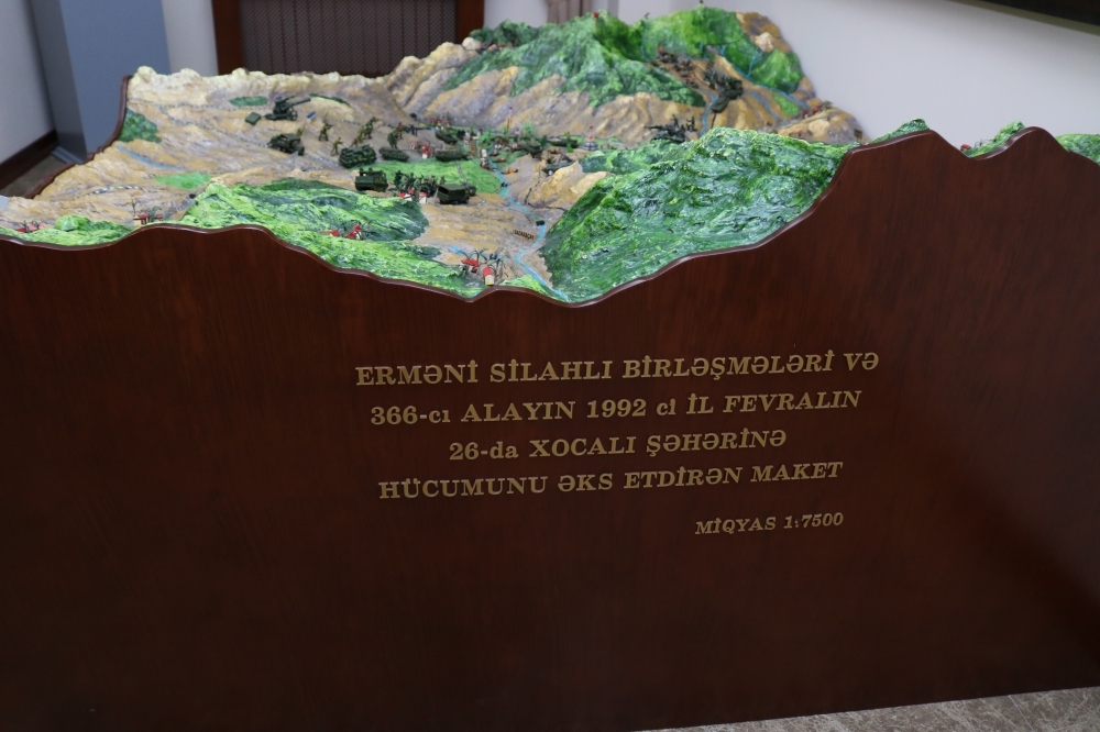 Baş ədliyyə müşaviri söylədi ki, muzeyin soyqırımı və terror bölmələrində erməni silahlı birləşmələri və keçmiş Sovet ordusunun 366-cı alayının 1992-ci il fevralın 25-dən 26-na keçən gecə Xocalı şəhərinə birgə hücumunun maket və fotoları, habelə digər eksponatlar yerləşdirilib. Həmin bölmələrdə 1992-ci il fevralın 26-da Xocalını və ətraf əraziləri özündə əks etdirən 1:7500 miqyasında maket qurulub. Hərbi Prokurorluğun apardığı ibtidai istintaq materiallarına uyğun olaraq hücum zamanı erməni silahlı birləşmələri və 366-cı alayın bölmələrinin yerləşdiyi ərazilər və onlar tərəfindən xüsusi amansızlıqla kütləvi qətlə yetirilmiş dinc əhalinin meyitlərinin olduğu yerlər də maketdə əksini tapıb. Bölmədə fakt üzrə aparılan cinayət işinin cildləri, hadisə yerinə baxış protokolları, erməni təcavüzkarlarının törətdikləri vəhşilikləri sübut edən əşyalar, ekspert rəyləri, ifadələr, meyitlərin fotoşəkilləri və eləcə də Xocalıda, Meşəlidə, Qaradağlıda və digər yaşayış məntəqələrimizdə törədilən cinayətlərin izlərini özündə əks etdirən əşyalar yer alıb. Eləcə də muzeyin eksponatları arasında bütünlüklə qətlə yetirilmiş ailələrin fotoşəkilləri və əşyaları da mövcuddur. Erməni terrorçularının istifadə etdikləri partladıcı qurğuların hadisə yerindən götürülmüş nümunələri də muzeydə saxlanılır.