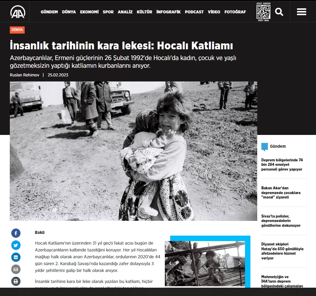 Türkiyənin Anadolu agentliyində yayımlanan “İnsanlıq tarixinin qara ləkəsi: Xocalı soyqırımı” sərlövhəli məqalədə bildirilib ki, Azərbaycan xalqı erməni hərbi birləşmələrinin 1992-ci il fevralın 26-da Xocalıda qadın, uşaq və qoca demədən törətdiyi qətliamın qurbanlarının xatirəsini yad edir. Faciəsi ilə bağlı faktların təqdim olunduğu məqalədə vurğulanıb: “Xocalı soyqırımından 31 il ötür, ancaq faciənin kədəri bu gün də azərbaycanlıların qəlbini göynədir. Azərbaycan xalqı Ordusunun 2020-ci ildə 44 günlük İkinci Qarabağ müharibəsində qazandığı Zəfərdən sonra artıq üç ildir ki, şəhidlərinin xatirəsini qalib xalq kimi anırlar. İnsanlıq tarixinə qara ləkə kimi yazılan bu soyqırımı heç vaxt unudulmasa da, işğal altındakı torpaqların azad edilməsi Azərbaycan xalqı üçün təsəlli oldu. İndi azərbaycanlıların yeganə istəyi Xocalı qətliamını törədənlərin mühakimə olunması və ədalətin təmin edilməsidir”.