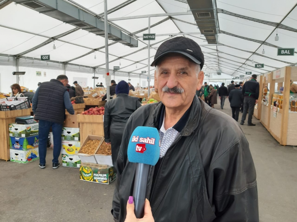 Dilqəm Quliyev: “Yarmarka nə zaman təşkil olunsa gəlirəm. Çünki qiymətlər sərfəlidir. Daha sonra satıcılar gülərüz və anlayışlıdırlar. Aldığım yerli mandarin aldım digər satış obyektlərində 3 manatadırsa, burada 1 manat 50 qəpiyə təklif olunur. 3 kilosu 1 manata alma aldım. Gül kələmi burada 80 qəpiyə, market və bazarlarda isə 2 manata satılır. Təbii ki, qiymət sərfəli olduğu üçün gül kələmini buradan aldım. Qiymətlər baha deyil, məhsullar da keyfiyyətlidir. Hər kəsin bayramı mübarək, süfrələri ruzi-bərəkətli, canları sağlam olsun.”