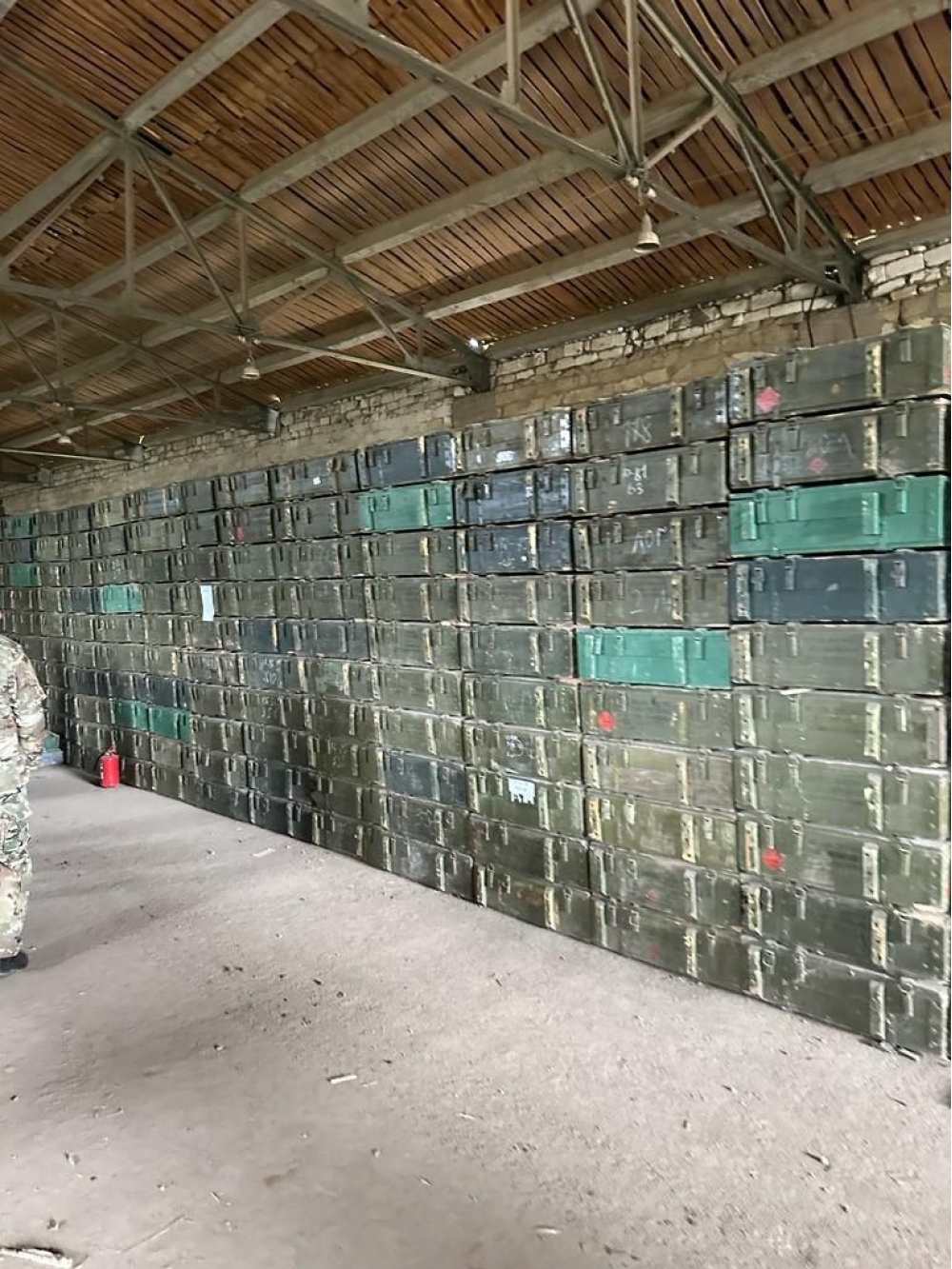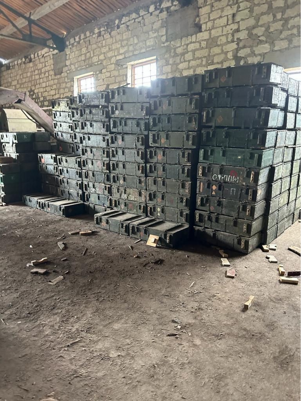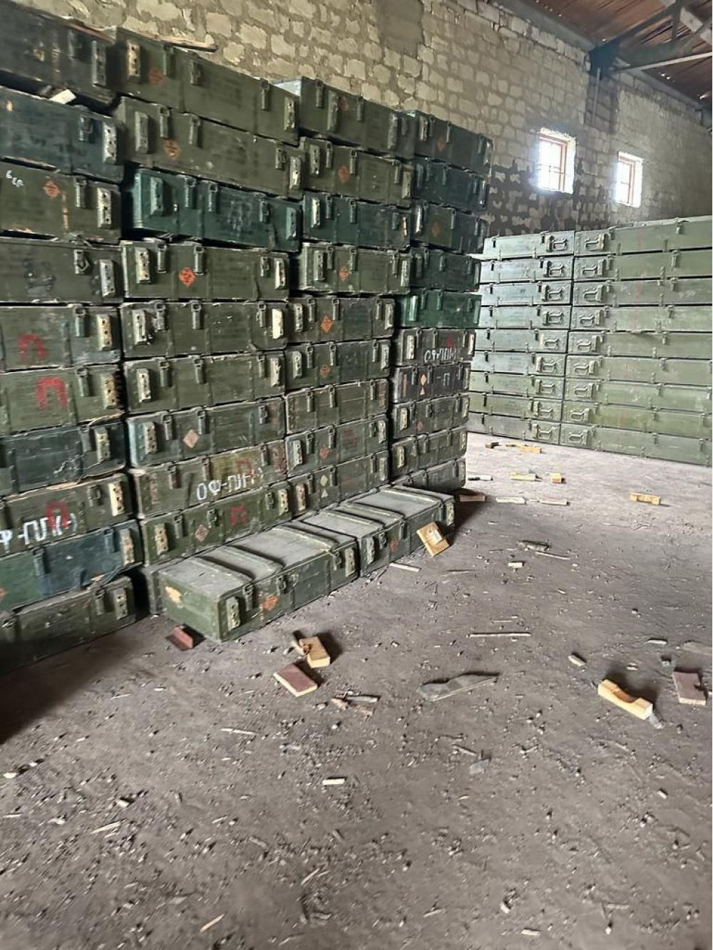 Anbar müxtəlif növ silah-susat, mərmi yeşikləri və digər hərbi təyinatlı məhsullarla doludur.