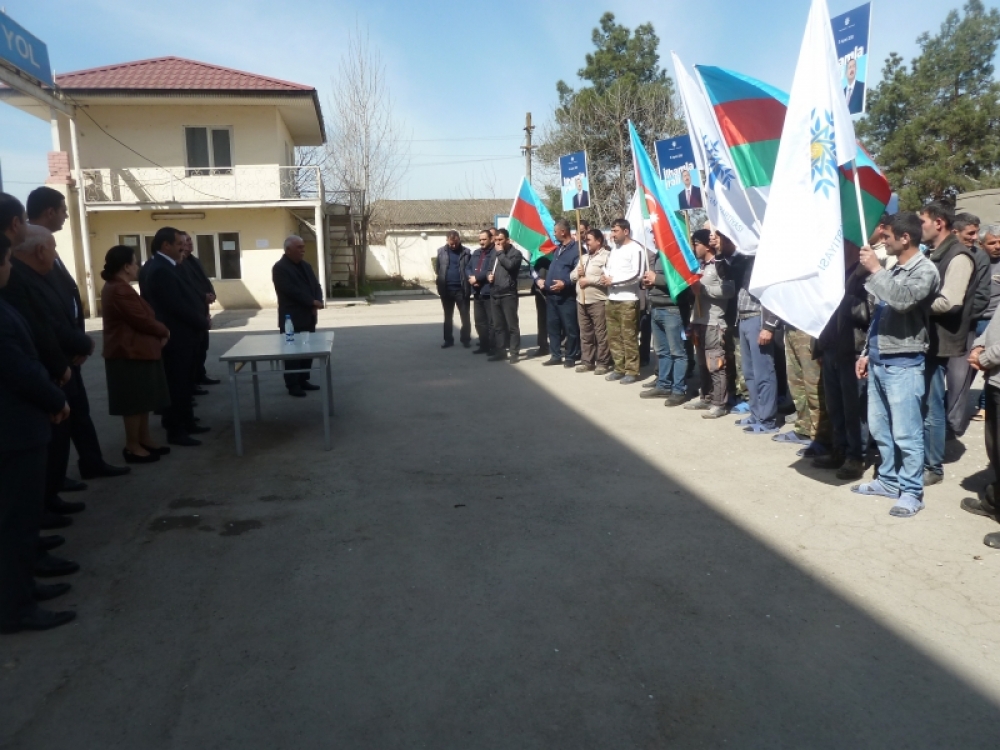 Çıxış edən təbliğat qrupunun üzvləri Sabir Novruzov, Talıb Məmmədov, Elmira Süleymanova, Valeh Qaraşov Azərbaycan dövlətinin son 15 ildə atdığı uğurlu addımlardan danışaraq, prezident seçkilərinin demokratiya yolunda növbəti addım olacağını bildiriblər: “Geridə qoyduğumuz 15 ilə nəzər salmaq kifayət edir ki, ölkəmizin, xalqımızın və dövlətimizin gələcəyini qarşıdakı illərdə də partiyamızın Sədri cənab İlham Əliyevin uzaqgörən və düşünülmüş siyasətinə etibar edək.”