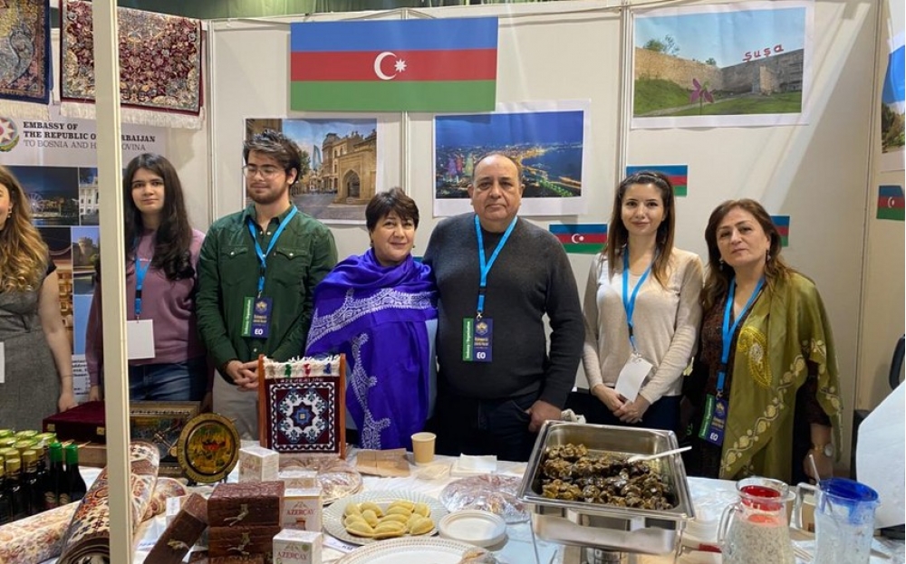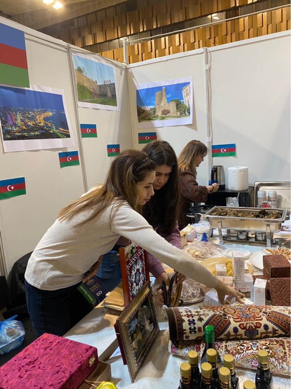 Səfirlik əməkdaşlarının xanımlarının hazırladıqları milli mətbəx nümunələri, habelə Azərbaycan şirniyyatları, çayı, mürəbbələri, suvenirləri, kiçik ölçülü xalçalar alıcılara təqdim olunub.