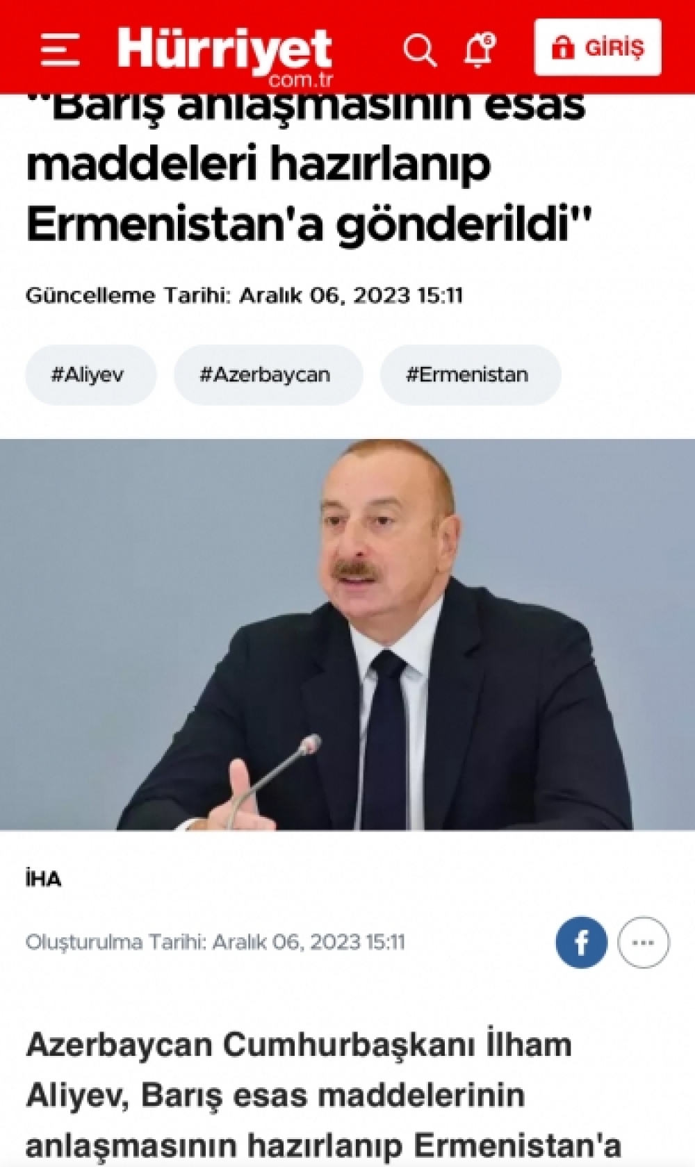 “Hurriyet.com” saytının “Sülh anlaşmasının əsas maddələri hazırlanıb Ermənistana göndərildi” sərlövhəli yazısında da Prezident İlham Əliyevin fikirləri əks olunub. Yazıda dövlətimizin başçısının fikirlərinə istinadla bildirilib ki, Azərbaycan iki il yarım bundan əvvəl suverenliyini bərpa etdikdə, Qarabağda böyük həcmdə çoxsaylı erməni kontingenti vardı və onlar heç bir beynəlxalq hüququn prinsiplərinə məhəl qoymurdular. Daha sonra Prezident İlham Əliyevin bu fikirlərindən sitat gətirilib: “Biz ümid edirdik ki, bu məsələ öz həllini tapacaq. Biz dərk edirdik ki, bu, anormal vəziyyətdir və İkinci Qarabağ müharibəsi bitəndən sonra bizim mövqeyimiz aydın idi. Qarabağda yaşayan insanların iki seçimi var - onlar ya Azərbaycan vətəndaşları olurlar və onların bütün hüquqi çərçivələri yaradılır və ya yaşayış üçün digər yerləri seçirlər. Bunun başqa yolu yox idi”.