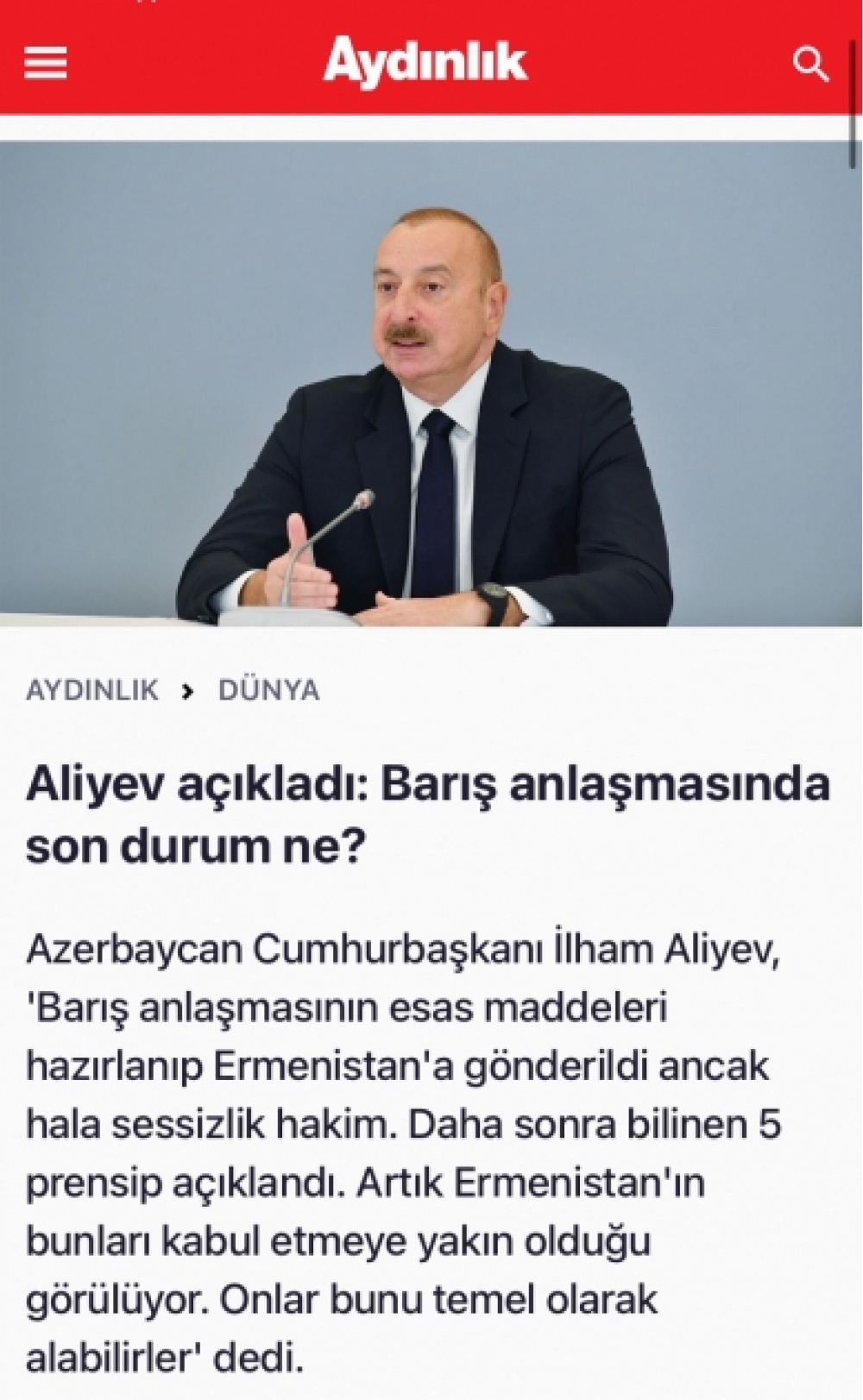 “Aydınlık” saytının “Əliyev açıqladı: Sülh sazişində son vəziyyət necədir?” başlıqlı məqaləsi isə “Bölgəyə sülhü gətirdik”, “Ermənilər üçün lazımi şərtlər yaradılır”, “Ermənistana əlimiz uzatdıq” kimi yarımbaşlıqlarla verilib. Yazıda Prezident İlham Əliyevin “Ermənistanın hazırda iki variantı var. Birincisi, öz xərcləri, yaxud da Avropa fondlarının pulu ilə dərhal 42 kilometrlik məsafədə dəmir yolu çəksinlər. Biz bunu, əslində, onların suveren ərazisi hesab edirik və suverenliklə bağlı bizim şərtimiz yoxdur. Lakin Azərbaycandan Naxçıvana asan çıxış olmalıdır. Bununla bağlı hansısa gömrük yığımı, yoxlamalar, sərhədçilərin prosedurları olmalı deyil. Bu, bizim legitim hüququmuzdur” - kimi fikirləri geniş yer alıb.