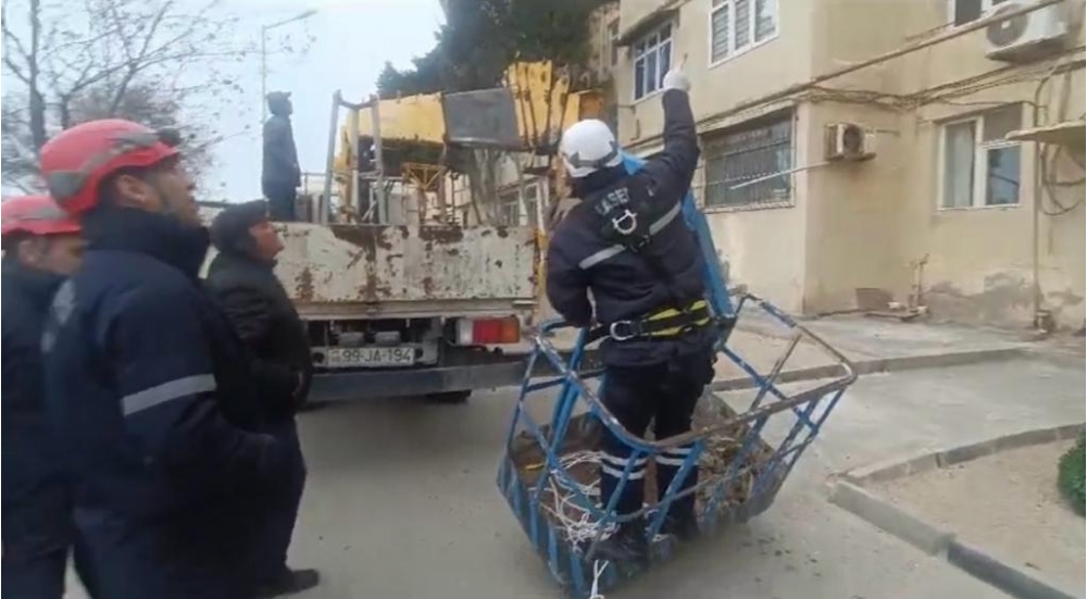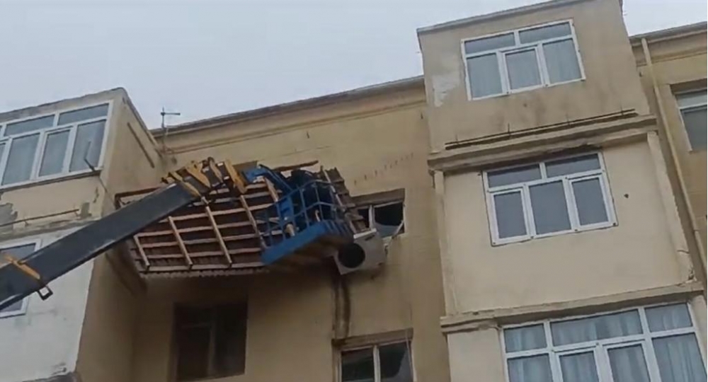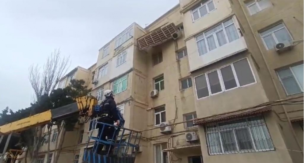 Pirallahıda külək nəticəsində binada yaranan təhlükəli vəziyyət aradan qaldırılıb - FOTO/VİDEO
