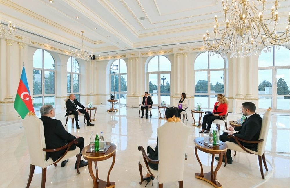 Cənab Prezident, yeni tarixi reallığı, yeni tarixi mərhələni yaşayırıq. Ən böyük reallıq qeyd etdiyimiz kimi, Qarabağın tam azad olunması, Qarabağdan separatizmin, terrorizmin təmizlənməsi və Sizin təbirinizcə desək, tarixin zibilliyinə atılmasıdır. Əlbəttə ki, hər bir reallığın arxasında güc, prinsipiallıq, əzm, iradə və Sizin “Dəmir yumruğunuzdur”. Məhz ona görə də mən istərdim elə ilk sualımı bugünkü reallıqlardan son 20 illik fəaliyyətə nəzər salmaqla başlayaq. Bu gün ərazi bütövlüyünü tam bərpa etmiş Azərbaycanımızdan, suverenliyimizi tam bərpa etmiş Azərbaycanımızdan son 20 illik fəaliyyətə nəzər salsaq, hansı mənzərə canlanır? Biz bu 20 ildə haradan-haraya gəlmişik?