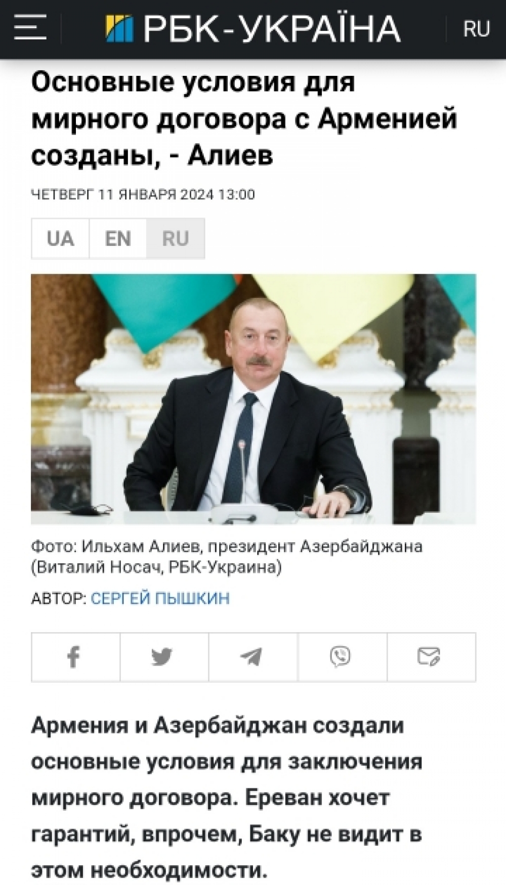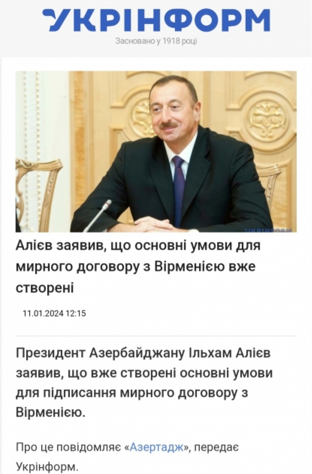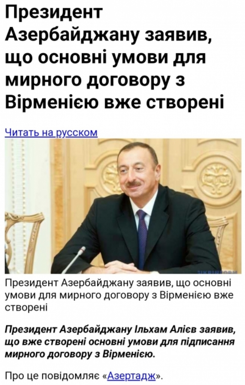 “İki sahil” xəbər verir ki, Ukrayna KİV-ləri Prezident İlham Əliyevin Ermənistanla sülh danışıqlarına dair fikirlərə xüsusi önəm verib. Qeyd olunub ki, Azərbaycan və Ermənistan sülh müqaviləsi bağlamaq üçün əsas şərait yaradıblar. İrəvan zəmanət istəyir, lakin Bakı buna ehtiyac görmür.