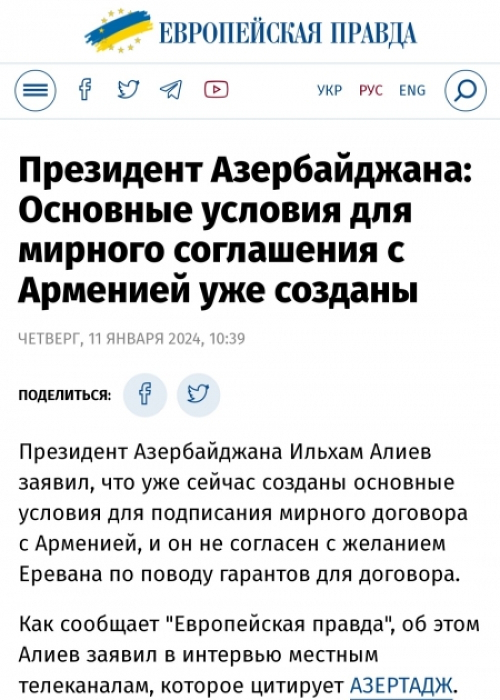 Azərbaycan Prezidenti İlham Əliyevin yanvarın 10-da yerli televiziya kanallarına müsahibəsi Ukrayna mediasında geniş işıqlandırılıb.