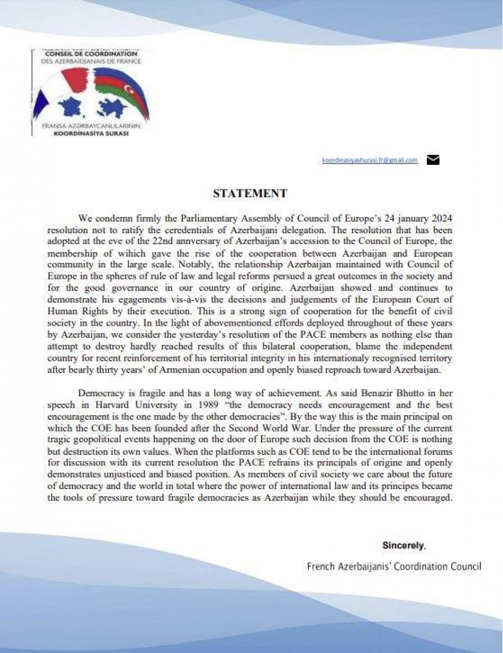 Fransada yaşayan Azərbaycan icması Avropa Şurası Parlament Assambleyasının (AŞPA) Azərbaycan nümayəndə heyətinin etimadnaməsinin təsdiqlənməməsi barədə 24 yanvar 2024-cü il tarixli qətnaməsini qətiyyətlə pisləyib.