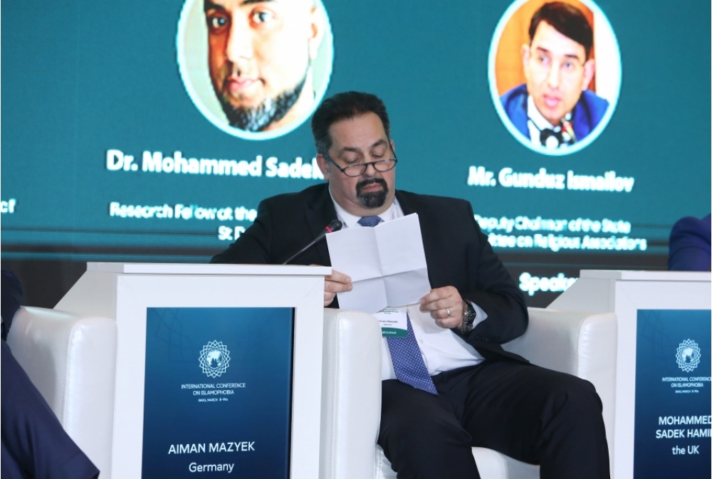 Bakı Beynəlxalq Multikulturalizm Mərkəzinin islamofobiyaya qarşı gördüyü işləri yüksək dəyərləndirən Ayman Mazyek qeyd edib ki, Azərbaycan bu sahədə çox vacib addımlar atır. “Prezident İlham Əliyevin forum iştirakçılarına müraciəti zamanı vurğuladığı fikirlər tamamilə doğrudur. İslamofobiya kimi hallar bəşəri dəyərləri alt-üst edir. Qərb ölkələrində milli azlıqlara qarşı edilənlər göz önündədir. Ayrı-seçkiliyin ən böyük təzahürlərindən biri ikili standartlardır. Məsələn, Avropada müqəddəs kitab “Qurani-Kərim”in yandırılması normal qarşılanır. Ancaq həmin ölkələrdə Tövrat, İncil yandırıla bilməz. İslamı terrorçu din kimi qələmə verənlər xristianların törətdiyi terror aktlarına səssiz qalırlar. Bütün bunlar tamamilə ikili standartlardır”, - deyə Mərkəz rəhbəri diqqətə çatdırıb.