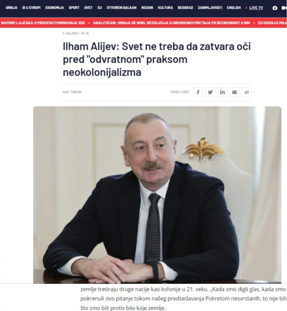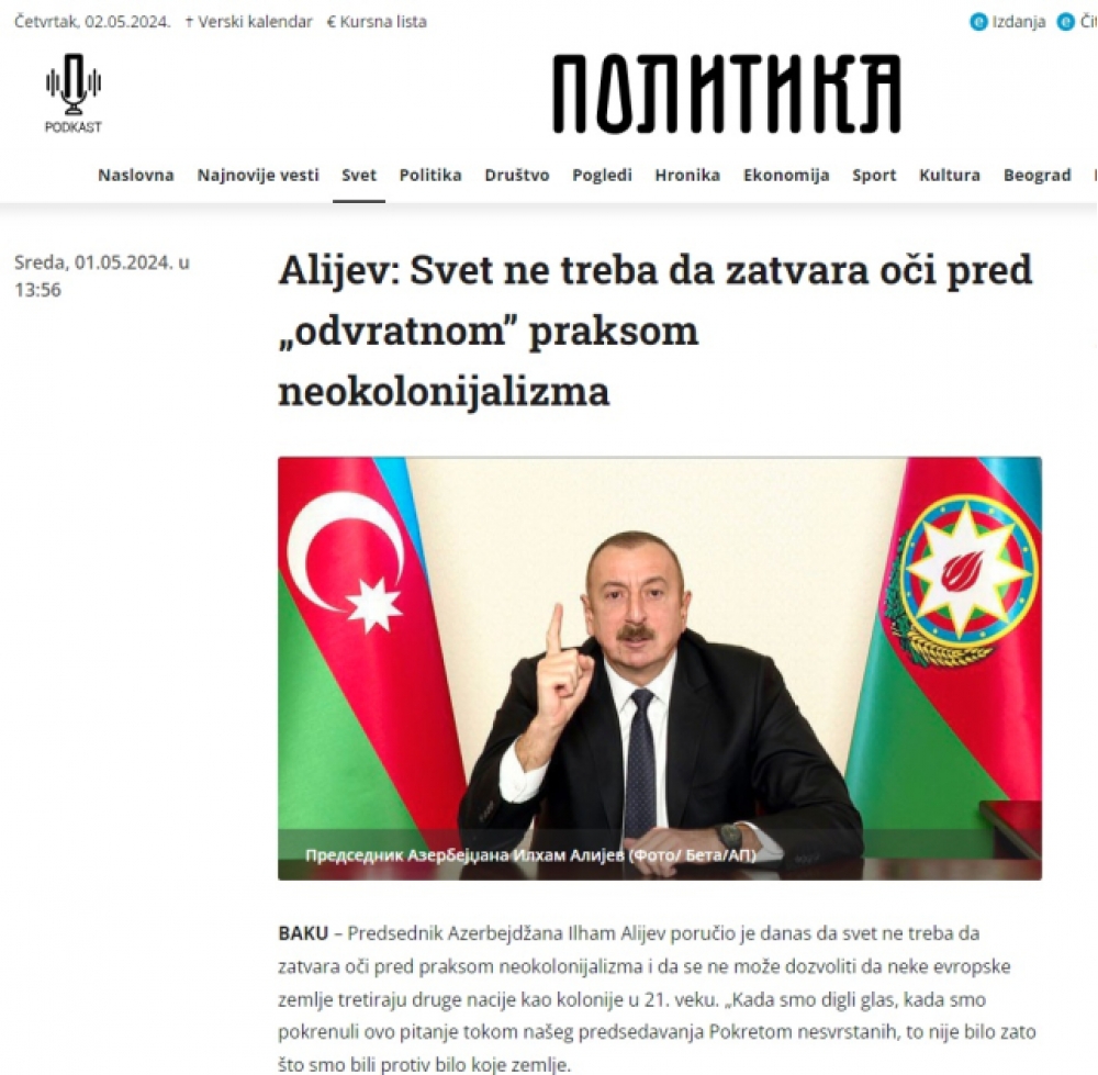 Prezident İlham Əliyevin Forumun açılış mərasimindəki nitqində səsləndirdiyi fikirlər Serbiya mətbuatının da diqqət mərkəzində olub. Bu ölkənin “Politika”, “Tanyug”, “Novosti”, “Alo.rs”, “Pink.rs” nəşrləri, “Voyvodine” radio-televiziyası dövlətimizin başçısının xüsusən neokolonializmlə bağlı fikirlərini önə çıxarıb. Bu ölkə mətbuatı xəbərləri oxuculara “Əliyev neokolonistlərə meydan oxudu: Biz imkan verə bilmərik ki, bəzi Avropa ölkələri digər xalqlara müstəmləkə kimi yanaşsın”, “Dünya neokolonializmin iyrənc praktikasına göz yummamalıdır” və digər sərlövhələrlə təqdim ediblər. Yazılarda dövlətimizin başçısının çıxışından aşağıdakı sitata xüsusi yer verilib:
