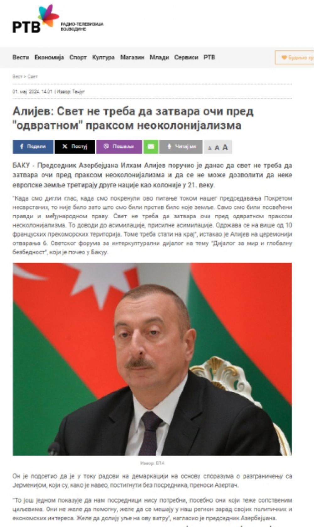 “Biz belə bir məsələyə imkan verə bilmərik ki, indi - XXI əsrdə bəzi Avropa ölkələri digər xalqlara müstəmləkə kimi yanaşsın. Təbii ki, biz öz səsimizi ucaltdıqda, Hərəkatda sədrliyimiz zamanı bu məsələni qaldırdıqda bu, onunla bağlı deyildi ki, biz hansısa ölkələrə qarşı idik. Biz, sadəcə, ədalətə, beynəlxalq hüquqa bağlı idik. Bu, yaddan çıxmalı deyil. Dünya məcburi assimilyasiyaya aparan belə bir iyrənc neokolonializm təcrübəsinə göz yummamalıdır. Ondan çox fransız dənizaşırı ərazisində həyata keçirilən məcburi assimilyasiya əsla qəbuledilməzdir və buna son qoyulmalıdır”.