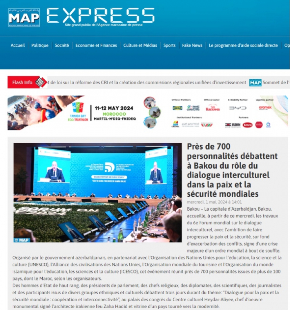 Mərakeşin “Mapexpress”, “Hespress”, “2M.ma”, Qətərin “Gulf Times”, Yəmənin “Pressbee” nəşrlərinin, Bəhreyn Xəbər Agentliyinin yayımladığı informasiyalarda VI Mədəniyyətlərarası Dialoq Forumunda 100-dən çox ölkədən 700-dək qonağın iştirak etdiyi bildirilib. Qeyd olunub ki, Forum çərçivəsində keçiriləcək 4 plenar sessiya və 12 panel iclasında təhsil, gənclər, iqlim dəyişikliyi, süni intellekt, mədəni irsin mühafizəsi, qanunsuz miqrasiya və digər mühüm mövzuların müzakirə olunduğu qeyd edilib. Məqalələrdə dövlətimizin başçısının Forumun açılış mərasimindəki çıxışında Azərbaycanın əsrlər boyu mədəniyyətlərin qovuşduğu məkan olması, çoxmədəniyyətli və böyük etnik müxtəlifliyə malik Azərbaycan cəmiyyətinin əsrlər boyu tolerantlığı, qarşılıqlı hörməti, dostluq və tərəfdaşlıq kimi dəyərləri qorumasına da fikirləri diqqətə çatdırılıb.