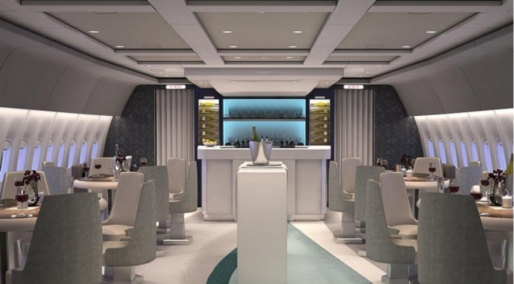 Təyyarədə 12 nəfər işləyir, onlar 38 müxtəlif dildə danışa bilirlər. Burada geniş bar və günorta yeməyi üçün mətbəx də var. Hətta menyu zamanı sərnişinlərə istəyindən asılı olaraq müxtəlif içkilər də təklif edilir. Təyyarənin bir istiqamətdə - Londondan Nyu-York istiqamətində uçması üçün kirayəsi 310 min ABŞ dollarıdır.
