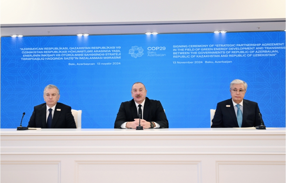 Dünən konfransdakı çıxışımda Azərbaycandan Qara dənizin dibi ilə Avropaya kabel xətti çəkməsi ilə bağlı ölkəmizin artıq həyata keçirilməkdə olan planlarından danışdım. Bu layihənin texniki-iqtisadi əsaslandırılması tamamlanmaq üzrədir və bununla da biz Mərkəzi Asiyanı, Qafqazı, Avropanı, Xəzər və Qara dənizləri vahid enerji dəhlizi ilə birləşdirəcəyik. Xüsusilə sevindirici haldır ki, bu Saziş hər zaman bir-birinə yaxın olan üç qardaş ölkə arasında imzalanır. Özbəkistanla münasibətlərimiz bu il müttəfiqlik münasibətləri səviyyəsinə çatıb, müvafiq saziş imzalanıb. Qazaxıstanla artıq uzun müddətdir ki, strateji tərəfdaş kimi əməkdaşlıq edirik. Qarabağın bərpasında bizə ilk yardım edən ölkələr Özbəkistan və Qazaxıstandır. Füzulidə Mirzə Uluqbəy adına məktəb, Kurmanqazı adına yaradıcılıq mərkəzi bu gün qardaşlığımızın bariz sübutudur. Əminəm ki, biz gələcəkdə də həmişə bir yerdə olacağıq və bir-birimizi dəstəkləyəcəyik. Əziz dostlarım, qardaşlarım Şavkat Miromonoviçə, Kasım-Jomart Kemeleviçə COP29-da iştirak etdiklərinə və öz iştirakları və dəyərli fikirləri, mesajları ilə tədbirimizi zənginləşdirdiklərinə görə minnətdaram.