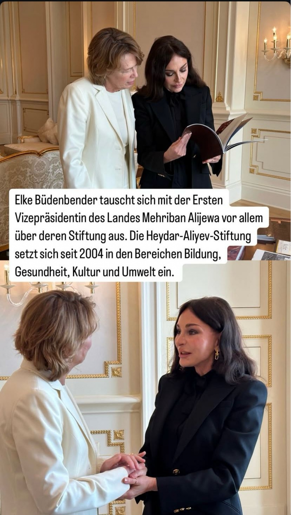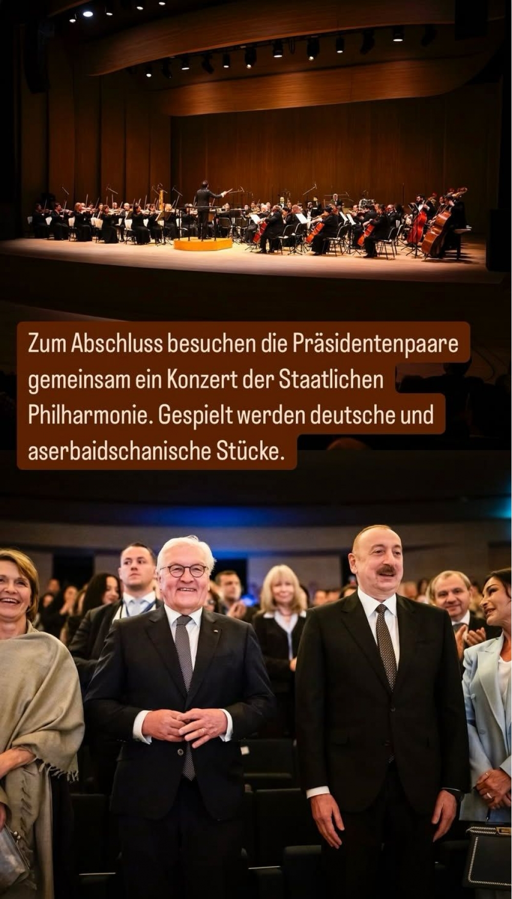 O, həmçinin paylaşımlarında İçərişəhərə səfərini, Azərbaycan və Almaniyanın birinci xanımları Mehriban Əliyeva ilə Elke Büdenbender arasında baş tutan görüşü, eləcə də Heydər Əliyev Mərkəzində məşhur Azərbaycan və alman bəstəkarlarının əsərlərindən ibarət konsert proqramını xüsusilə qeyd edib.