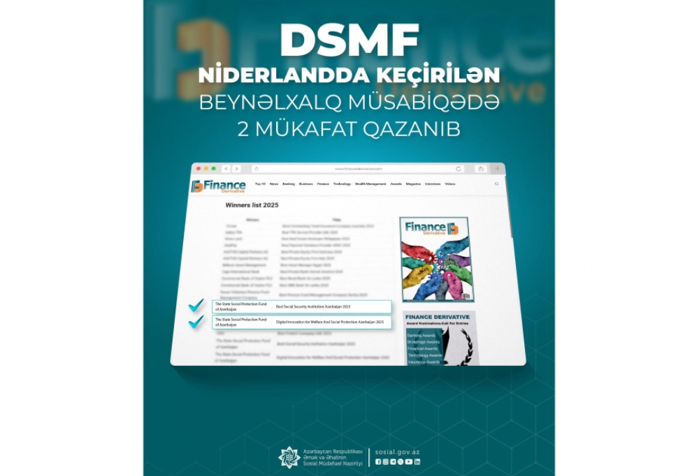 Əmək və Əhalinin Sosial Müdafiəsi Nazirliyinin tabeliyində Dövlət Sosial Müdafiə Fondu (DSMF) “Finance Derivative Awards 2025” beynəlxalq müsabiqəsində iki mükafata - “2025-ci ilin Ən Yaxşı Sosial Təminat Qurumu” və “Rifah və Sosial Müdafiə üçün 2025-ci ilin Rəqəmsal İnnovasiyası” nüfuzlu ali mükafatlarına layiq görülüb.