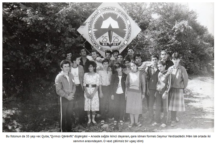 Xatırladım ki, sovet dövründə fəal məktəbli komsomolçular üçün mükafatlandırma metodlarından biri onları respublika, yaxud ittifaq çərçivəsində düşərgələrə istirahətə göndərmək idi. O zaman Bakıdakı Yuri Qaqarin adına pioner və məktəblilər sarayının (hazırki Tofiq İsmayılov adına Uşaq Gənclər Yaradıcılıq Sarayı) nəzdində olan və Qubanın Əmsar kəndində yerləşən “Qırmızı Qərənfil” düşərgəsi fəaliyyət göstərirdi. Hər il Azərbaycanın müxtəlif şəhər və rayonlarında öz fəallığı ilə fərqlənən 4-5 məktəbli komsomolçu həmin düşərgəyə istirahətə göndərilirdi. 1990-cı il üzrə Yevlaxda fərqlənərək bu mükafata layiq görülən 5 məktəblidən biri də mən idim.