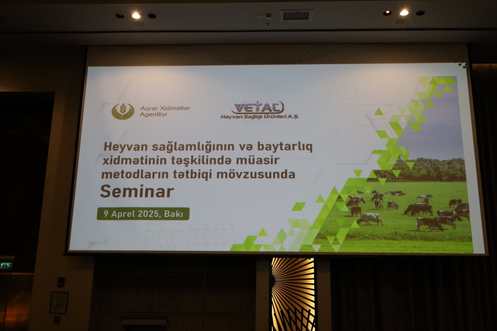 Kənd Təsərrüfatı Nazirliyi yanında Aqrar Xidmətlər Agentliyi (AXA) və Türkiyənin “Vetal Hayvan Sağlamlığı Ürünleri” şirkətinin birgə təşkilatçılığı ilə yerli və özəl baytar mütəxəssislər üçün “Heyvan sağlamlığı və baytarlıq xidmətlərinin təşkili sahəsində müasir metodların tətbiqinə dair” seminar təşkil olunub.
