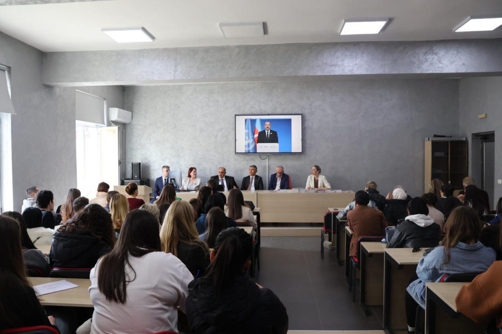 BSU-nun rektoru Anar Nağıyev “Yeni dövrün Azərbaycanı” mövzusunda çıxış edərək, Prezident İlham Əliyevin müvafiq Sərəncamına əsasən 2025-ci ilin “Konstitusiya və Suverenlik İli” elan edildiyini vurğulayıb. Rektor Ümummilli lider Heydər Əliyevin müstəqil Azərbaycanın formalaşması və inkişafı istiqamətindəki misilsiz xidmətlərindən bəhs edərək, onun rəhbərliyi ilə 1993-cü ildən sonra ölkənin hüquqi bazasının təkmilləşdirilməsi və 1995-ci ildə ilk Konstitusiyanın qəbul edilməsi prosesindən danışıb. A.Nağıyev Azərbaycanın dövlət quruculuğu, beynəlxalq əlaqələri, müasir dünyada Azərbaycanın rolundan bəhs edib. O, xüsusilə Ümumilli Lider Heydər Əliyevin rəhbərliyi altında Azərbaycanın müstəqilliyinin qorunması və güclü dövlət qurulması istiqamətində həyata keçirilən fundamental islahatlar barəsində ətraflı məlumat verib.